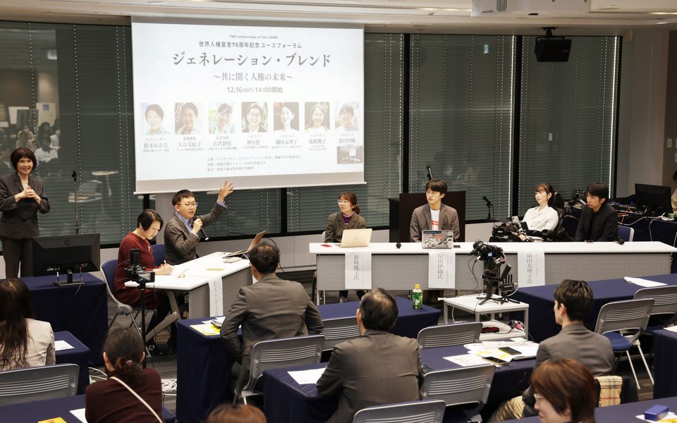A panel moderated by Kaoru Nemoto, Director of United Nations Information Centre Tokyo, hosted four young human rights activists who shared their activities in their respective fields: Yuichi Kamiya, Yuriko Oda, Momoko Nojo and Iori Harada.