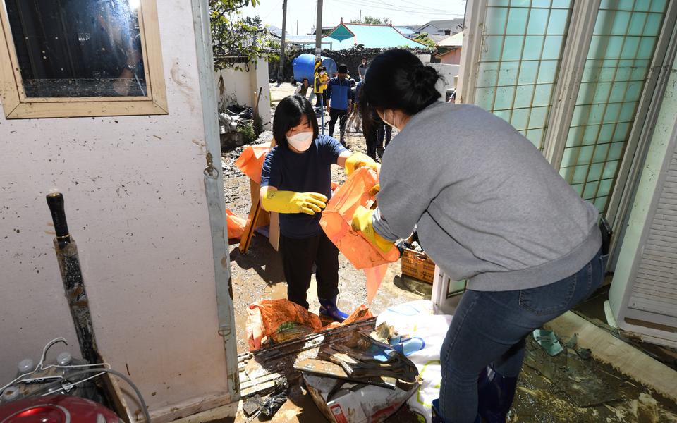 From 6–8 September 2022, 100 KSGI leaders and 73 youth members from Daegu and Pohang visited Pohang City to support those affected. The volunteers helped residents to clean their houses, move damaged items, clear mud and repair outdoor storage sheds destroyed by the torrential rainfall. They also delivered relief supplies to injured victims. While engaging in relief activities, the volunteers also provided emotional support to local KSGI members who had been affected by the typhoon. KSGI General Director Kim In Soo took part in the relief efforts and shared words of encouragement.