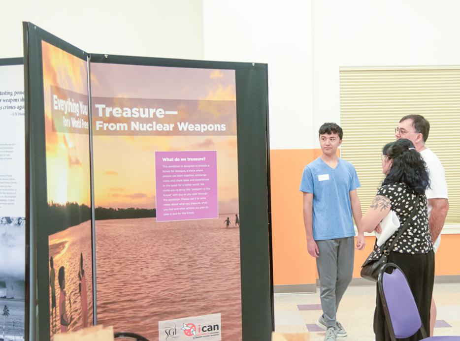 Participants view the SGI exhibit “Everything You Treasure—For a World Free From Nuclear Weapons.” | Photo credit: George Nakamura.