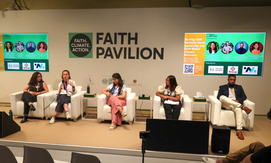 Lucy Plummer of SGI (second left) speaking at a side event on "Moving Faith Forward: Youth Leadership and Faith-based Climate Advocacy" at the Faith Pavilion.