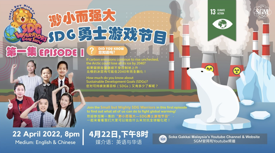 Commemorating Earth Day on 22 April 2022, the Soka Gakkai Malaysia (SGM) Junior Division launched the first episode of a three-part series titled, “Small but Mighty—SDG Warriors Game Show” on SGM’s website and YouTube channel. The videos are available in English and Chinese and each features a different theme of the Sustainable Development Goals (SDGs) presented in the style of a game show.