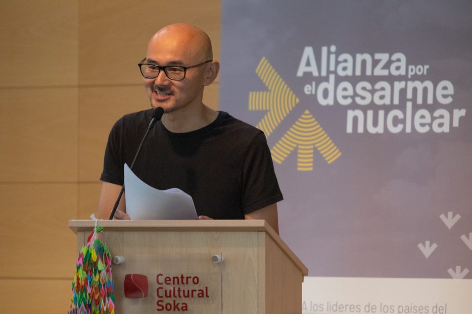 Yoshihiro Nakashima, a third-generation hibakusha and member of the Soka Gakkai of Spain, shares his testimony | Photo credit: Teresa Arilla