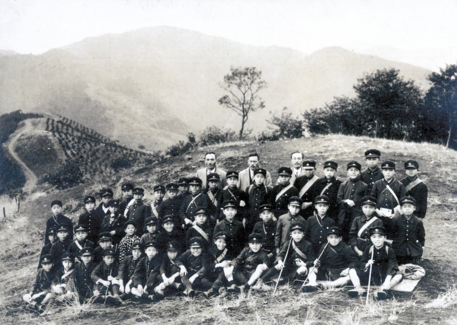 Tsunesaburo Makiguchi (back row, center) during a school trip to Mt. Takao, Hachioji, with students from Shirokane Elementary School around 1928 © Seikyo Shimbun