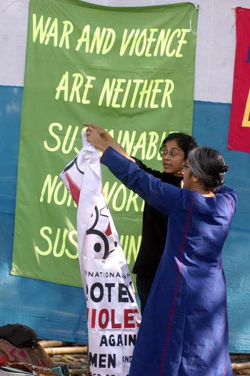 banners at an exhibition held to mark World Human Rights Day. [Photo credit: © AFP]