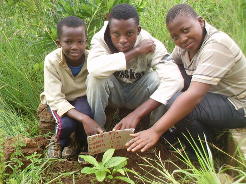 Young peace club members, who are mostly orphans, involved in an organic orchard project at the ecovillage. [Photo credit: Sarah Motha]