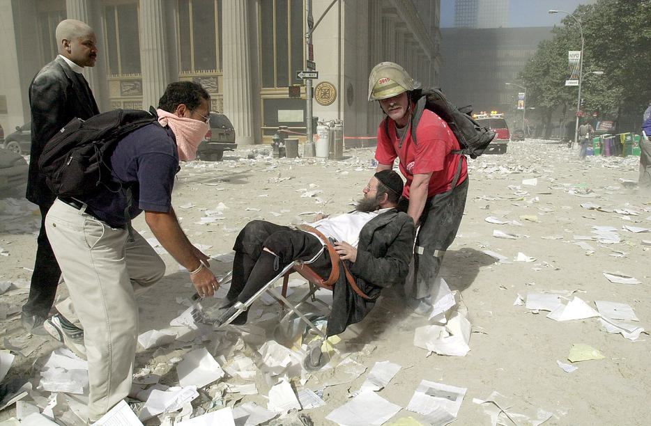 Evacuating a man through rubble and debris after the collapse of one of the World Trade Center towers in New York on September 11, 2001. [Photo credit: © Stan Honda/AFP]