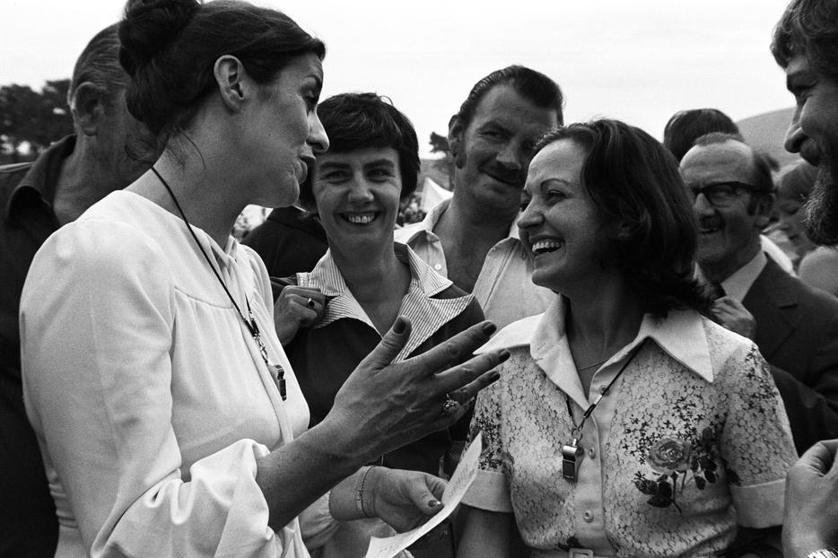 Betty Williams, left, and Mairead Corrigan Maguire, joint winners of the 1976 Nobel Peace Prize, lead a peace rally of Catholic and Protestant women in Belfast, August 28, 1976. [Photo credit: Alex Bowie/Getty Images]