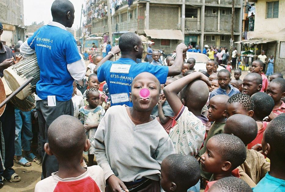 Sisi ni Amani team members reach out to the community in Baba Dogo, an informal settlement in Nairobi [Photo credit: Thatcher Cook/CC BY-SA 2.0/Cropped]
