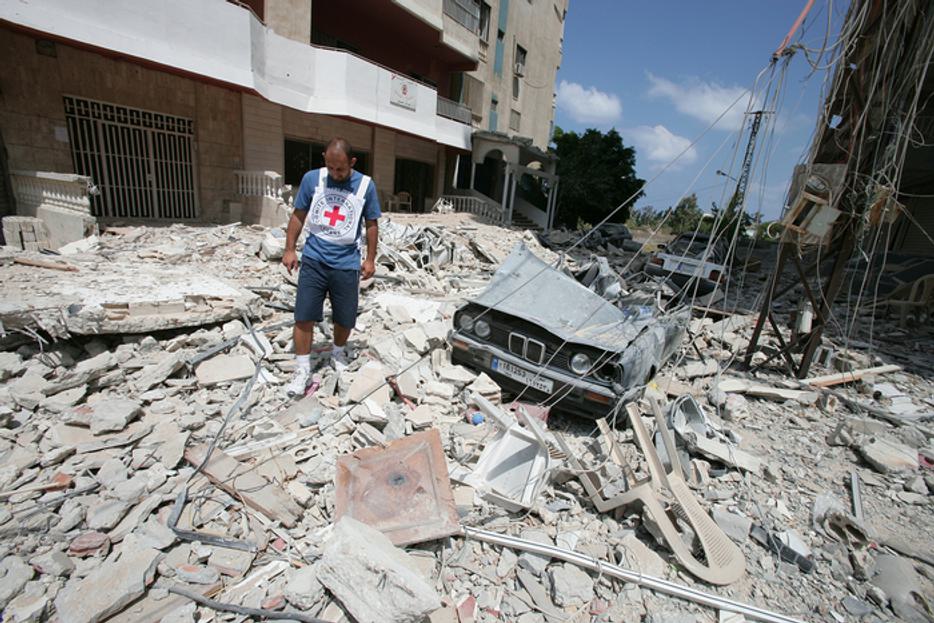 An ICRC staff member in the aftermath of conflict in Lebanon. [Photo credit: Till Mayer/ICRC]