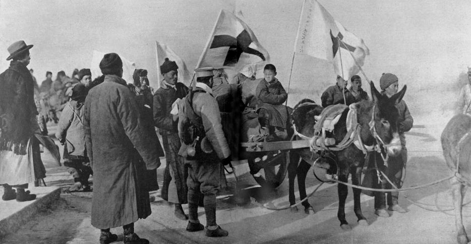 A refugee convoy protected by the Red Cross in China, 1926. [Photo credit: © Photo12/UIG/Getty Images]