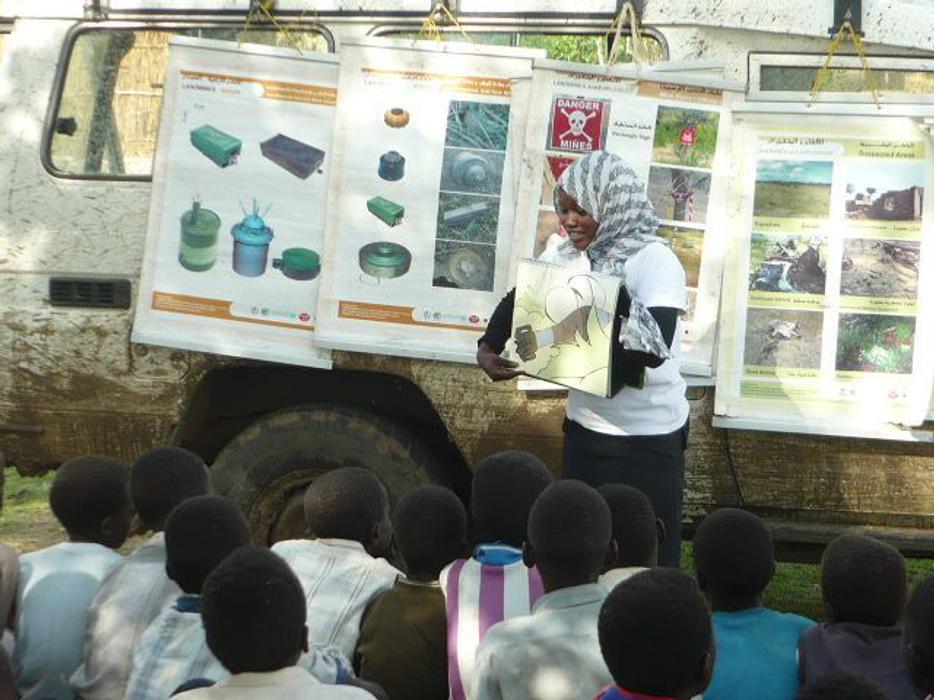As a female mine risk education (MRE) officer in Sudan, I work with women who are not only exposed to the risks of landmines and UXOs, but also deprived of basic human needs such as clean water, healthcare and education. I visit villages and schools in the areas at risk of landmines and UXOs and conduct educational sessions to raise awareness about the risks of landmines and how to minimize those risks.