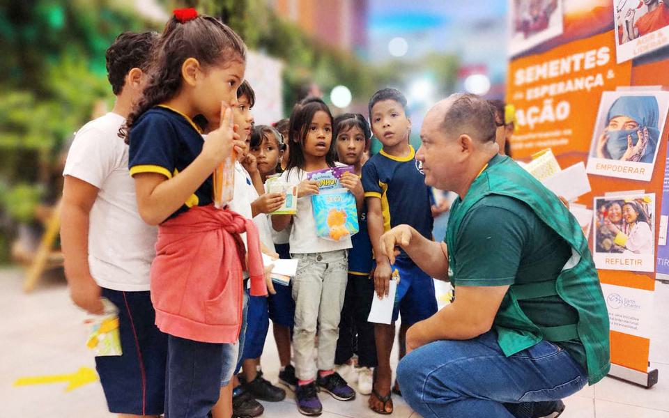 The initial section introduces the idea of interconnection with inspiring quotes from different spiritual and faith traditions. There are panels on climate change and the SDGs and QR codes provide links to further information for online use. An interactive panel collects viewers’ ideas for action inspired by the exhibition. It also introduces the “#SeedsofHopeandAction” hashtag campaign that encourages individuals to share photos and videos of their actions toward implementation of the SDGs and related Earth Charter principles on social media.