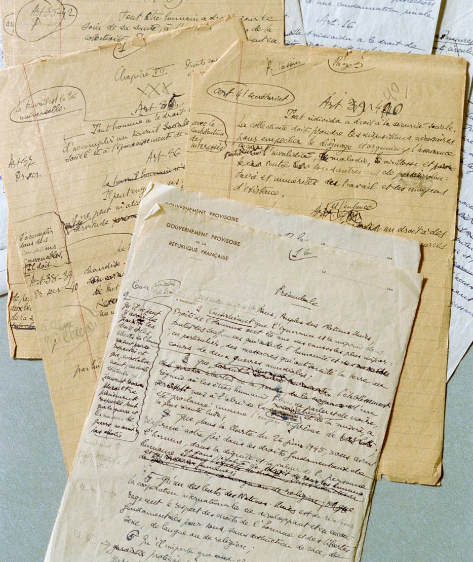 An early draft version of the Universal Declaration of Human Rights. [Photo credit: © UN Photo/Greg Kinch]