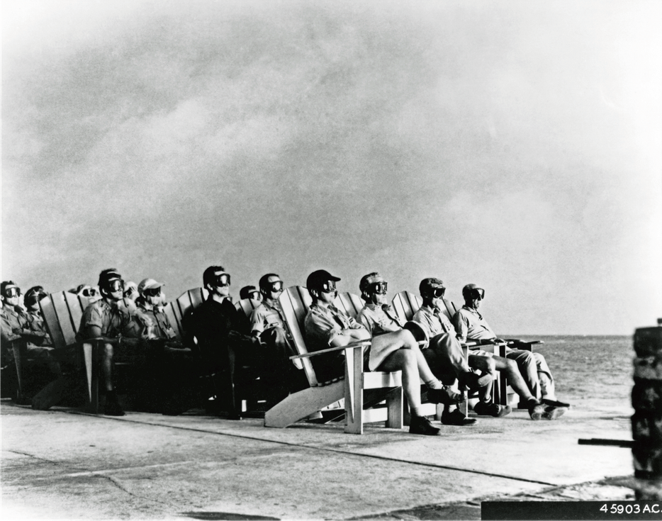 High-ranking personnel watch an atomic detonation at an American testing ground in the Pacific, 1951. [Photo credit: © Sygma/Corbis]